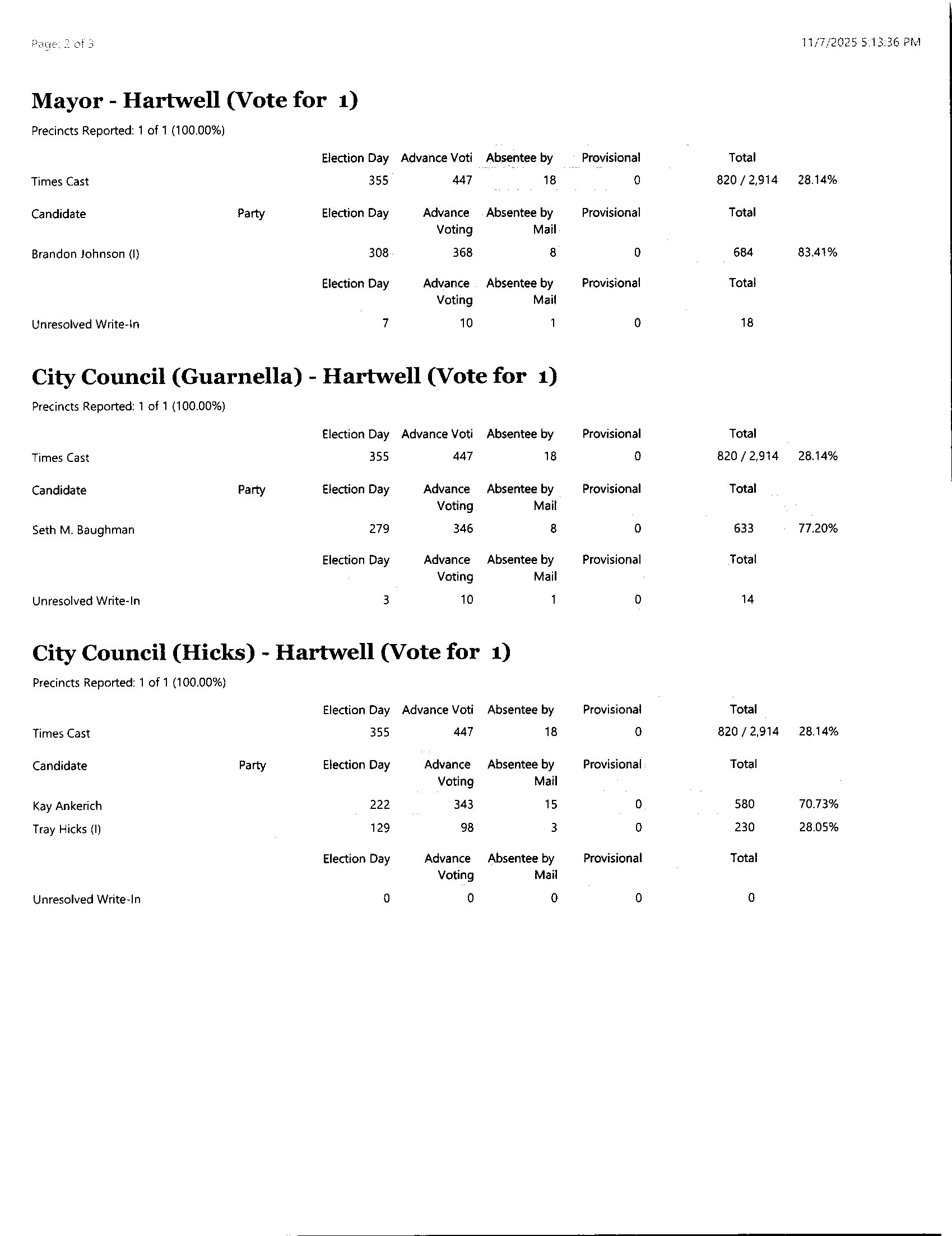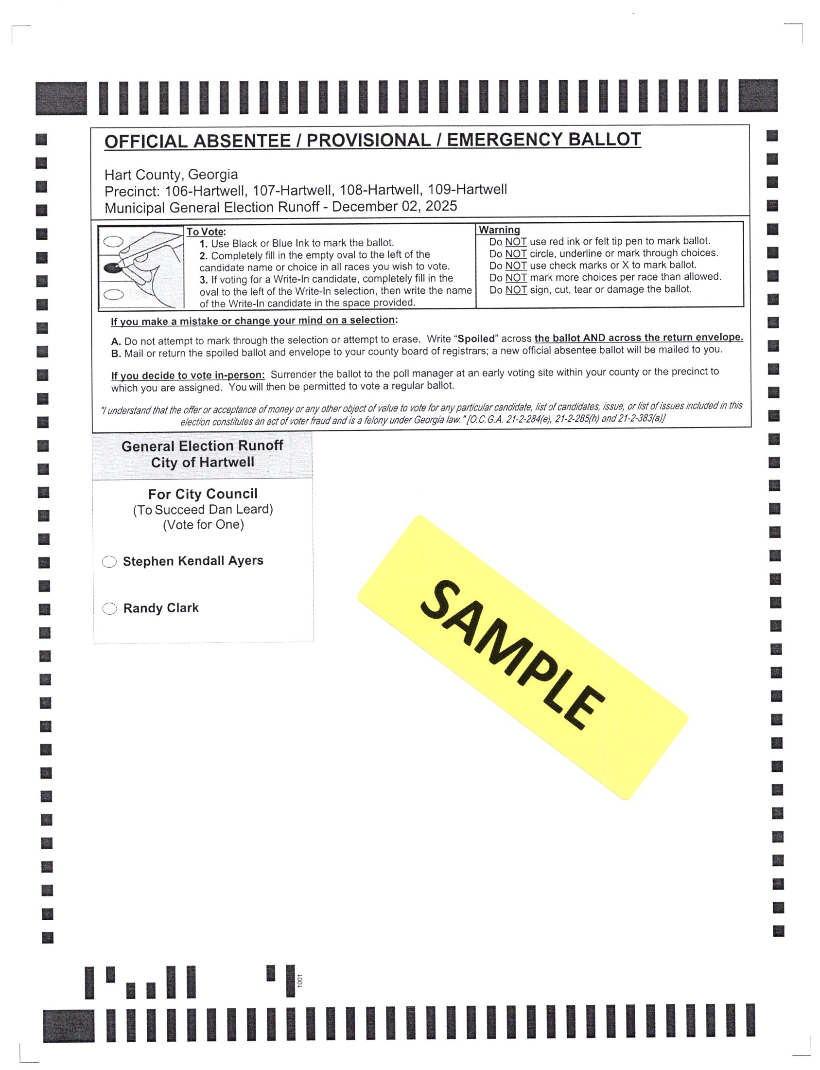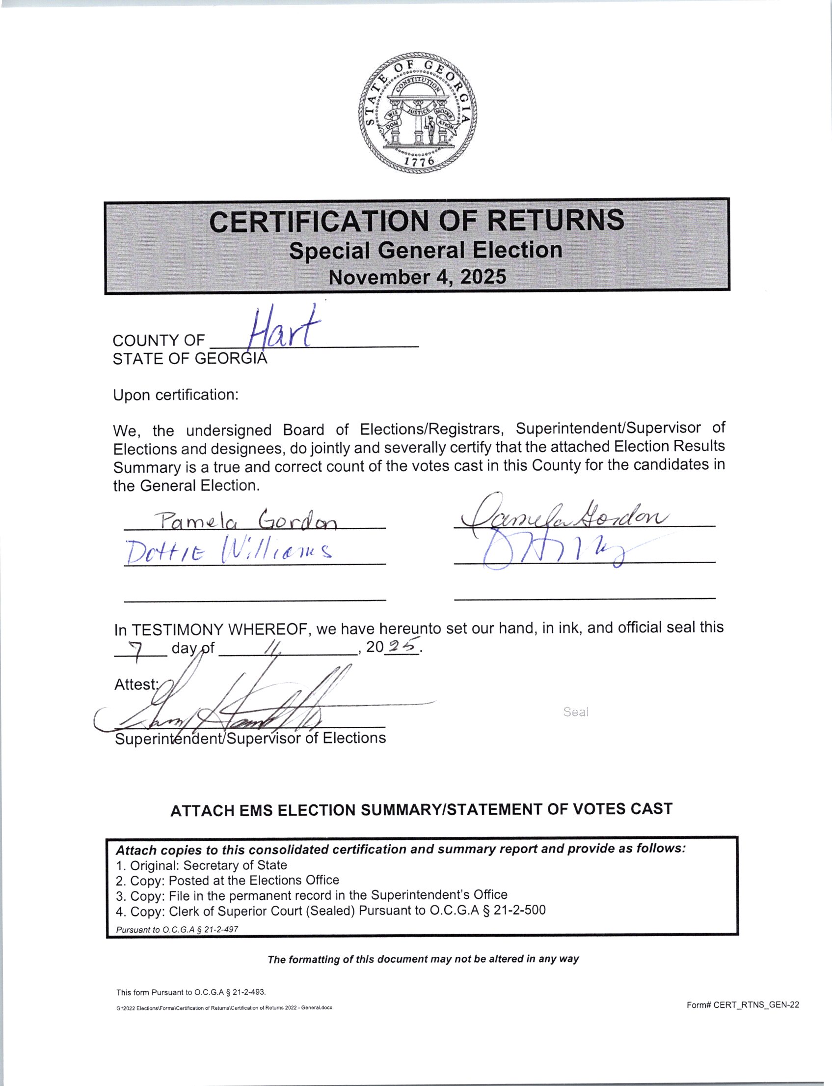 Sample Ballot Audit Results Certificat of Returns 1 Certificat of Returns 2 Certificat of Returns 3 Certificat of Returns 4 RLA notice 2025 Notice of sonsolidation and canvassing Notice of Processing Ballots Voting Checklist Qualified Candidates Notice of Election Cancellation Advanced Voting Notice L&A Public Notice City of Hartwell Call for Election ARE YOU ELECTION READY Hart County Precinct Addresses House Bill 1018 - Powers & Duties of the Board Bylaws of the Board of Elections |